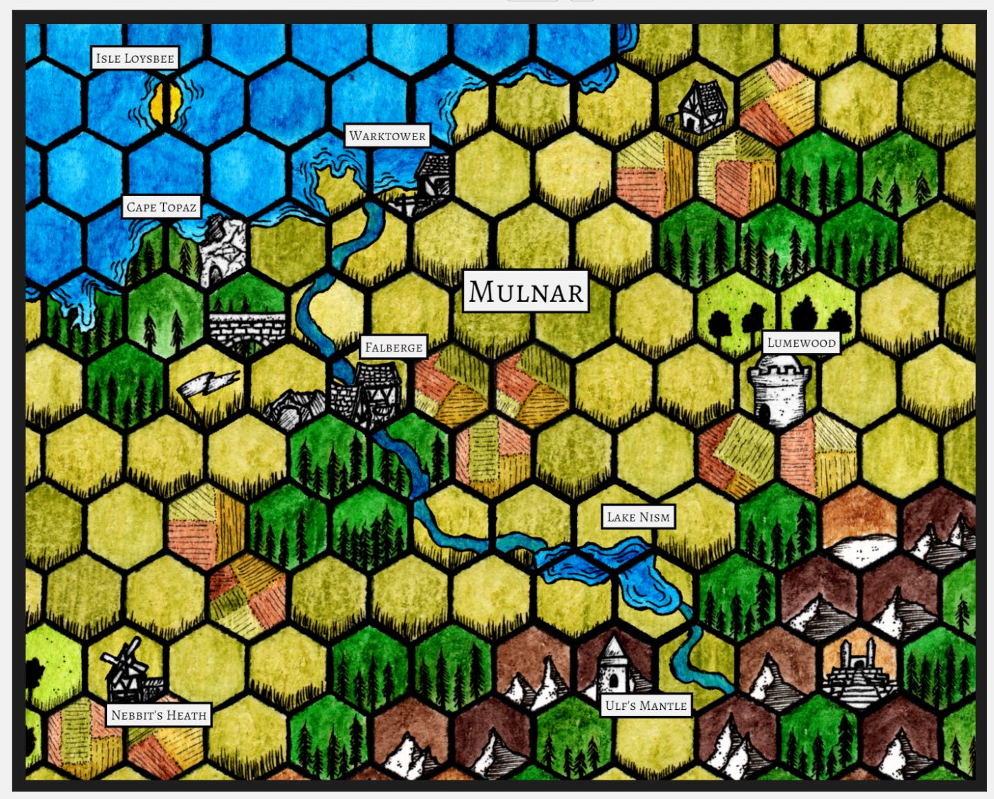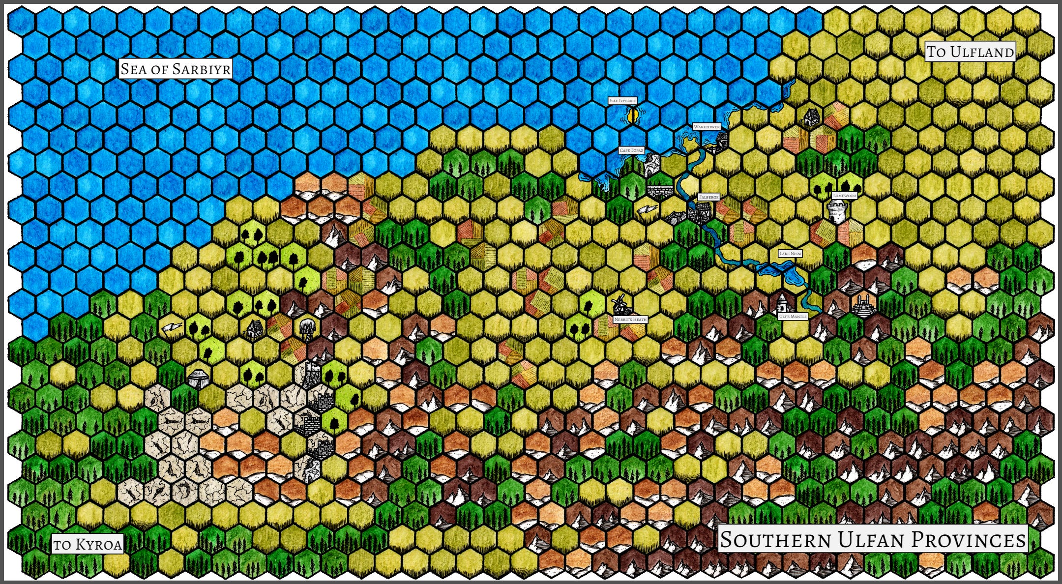 You’ll note that there’s more to do before it’s complete. The left side is unfinished and the coastline (particularly tricky in Hex Kit) needs work. Do you have any feedback for this version of the map? Do the orchards stand out too much? How about the wasteland in the southwest area? Is there a biome type missing?