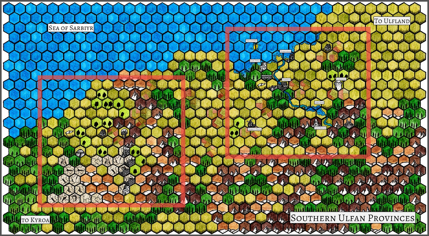 What initially appeared as two versions of the same region are actually sister domains and neighboring seats of power. Here I’ve combined the two maps plus some edits to smooth the colors of the landscape, especially on the left side. Storywise I’m not ready to finish the region, but I’ve filled in the middle section and the perimeter with suggestions of wilderness to get a complete look. Here’s the map without the boxes.