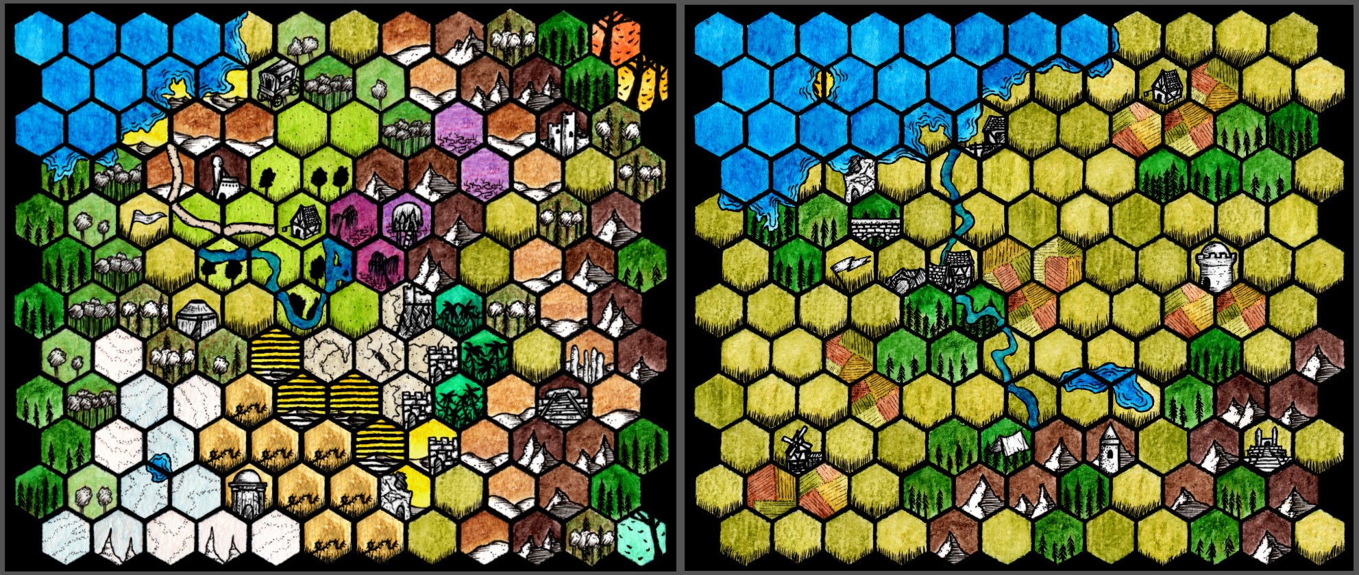 Responders found the colors on both maps to be bright, verging on overwhelming. A good suggestion was to reduce the thickness of the black lines between the hexes, but this is not a custom option in Hex Kit. Perhaps this Black Spot Tile Set could be the ticket to a more balanced aesthetic. A helpful community member also gave a list of links for community created Hex Kit tile sets.