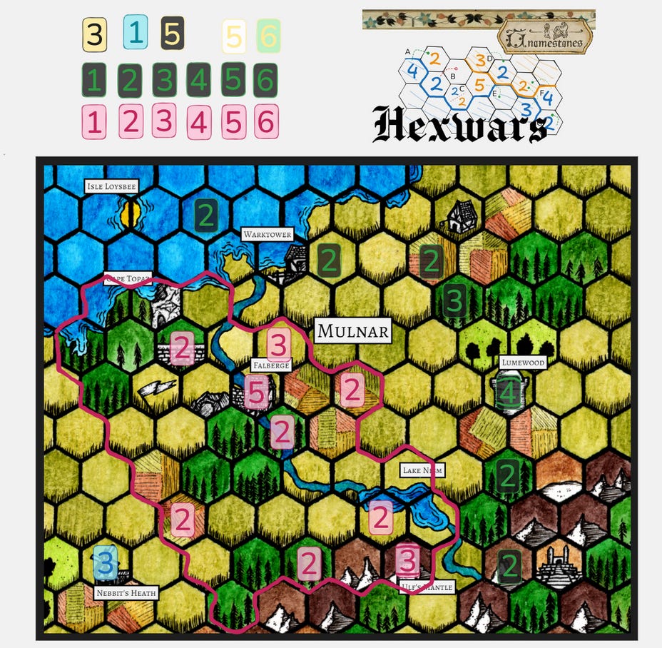 At this point we can upload the image of this map to Excalidraw, where it will serve as a background for our Hexwar. We’re using numbered icons as tokens to indicate the location and strength of warband units.